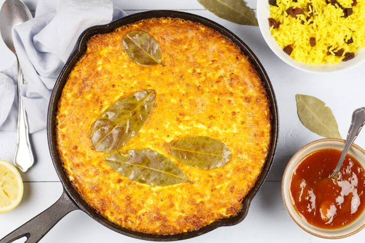 Once the minced meat is baked, the top becomes golden and custard-like. You can then serve it with yellow rice and maybe a spoonful of chutney.