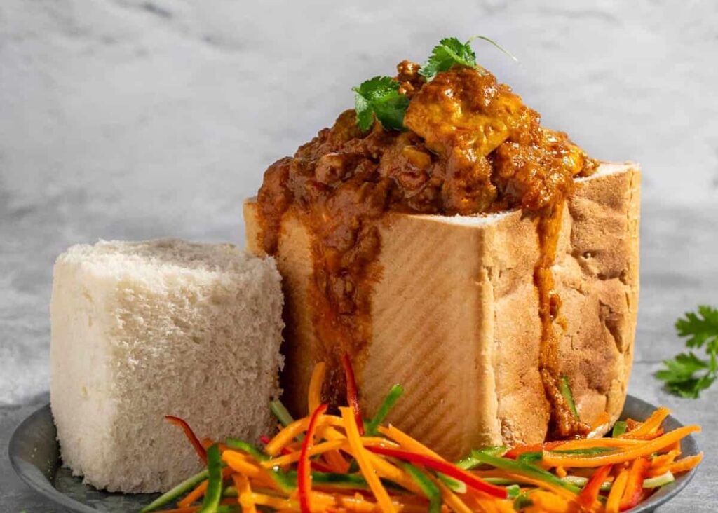 Bunny Chow is South Africa’s iconic street food, and it was born in Durban’s Indian community. Imagine a hollowed-out loaf of white bread, filled to the brim with spicy curry sauce made with lamb, chicken, beef, or even beans if you’re going meat-free.