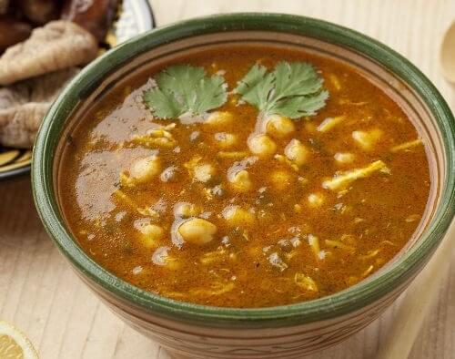 This popular North African meal is a tomato-based soup garnished with lentils, chickpeas, vermicelli noodles, and meat (usually lamb or beef). It’s seasoned with turmeric, cinnamon, ginger, and fresh herbs like coriander and parsley.