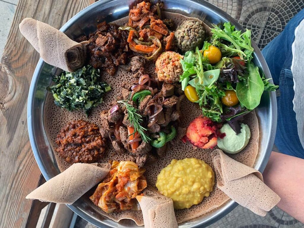 On top of this flatbread, you’ll find piles of spicy stews, sautéed veggies, and lentils, dishes like doro wat (chicken stew) or misir wat (spiced lentils). Having these dishes on makes Injera a plate in itself.