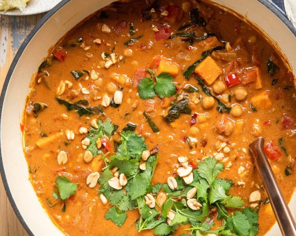 Peanut Stew, also known as Maafe, is a classic comfort food in West African countries like Mali, Guinea, and The Gambia. It is made with ground peanuts (or peanut butter), tomato paste, onions, and either chicken or beef.